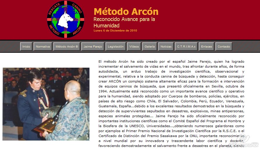 Y es precisamente eso lo primero que se topa uno al visitar la web del llamado "Método Arcón" de adiestramiento para perros de rescate. Eso y un montón de fotografías y alusiones a los muchos méritos de su creador (y propietario de la página), de quien se incluye nada menos que una "Biografía oficial", con lo cual las alarmas empiezan a adoptar un tono ensordecedor.