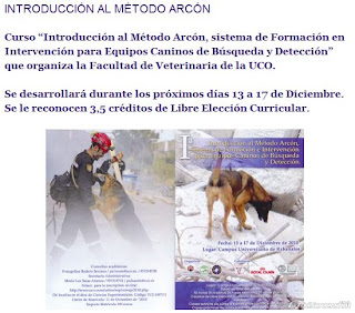 Desde el 13 al 17 de diciembre de 2010, se impartirá oficialmente en la Universidad de Córdoba, por la citada Institución, el I curso “Introducción al Método Arcón, sistema de formación e intervención para Equipos Caninos de Búsqueda y Detección”.