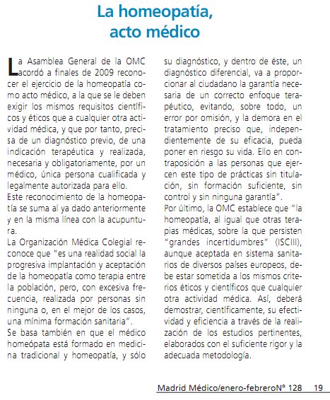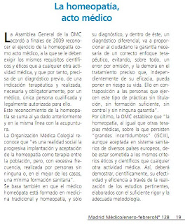 El pasado mes de agosto tuvo gran repercusión esta entrada de "Diario de un Troll", en la que se nos contaba que el Colegio de Médicos de Madrid apoyaba la homeopatía. La entrada reproducía una página de la revista del Colegio en la que se podía leer que, efectivamente, se consideraba a la homeopatía como "acto médico" a realizar única y exclusivamente por médicos.
